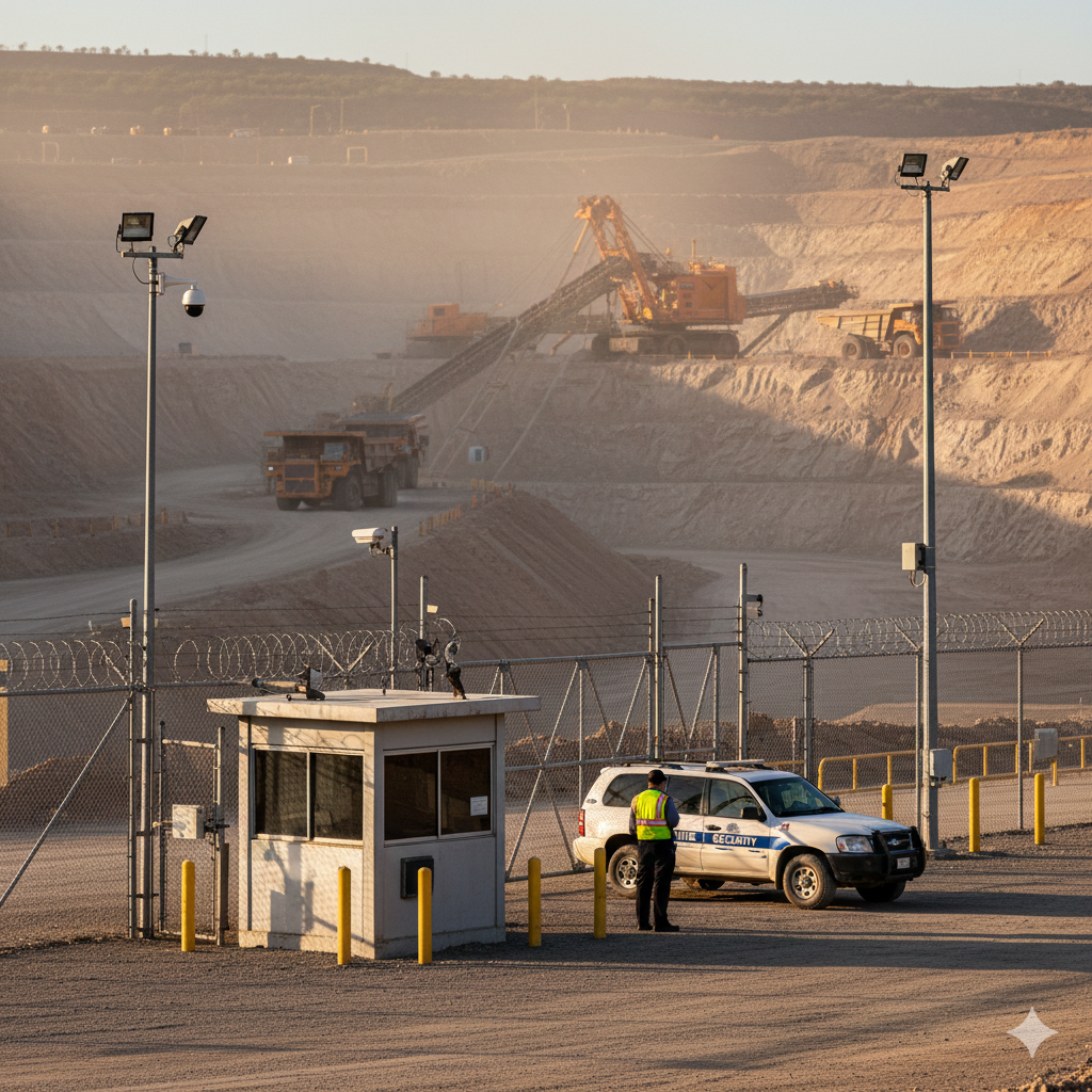 Specialized security for mining sites and extraction facilities to protect production and logistics flows.